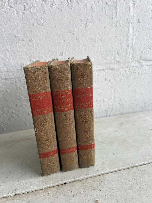 VINTAGE BOOK STACK | vintage green with red & gold accents, Robert Louis Stevenson, table styling, old books, coffee table books