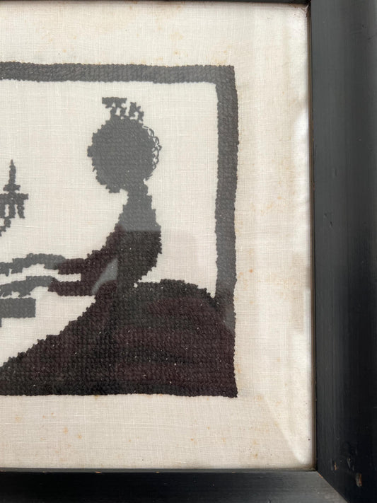 Vintage Hand-Stitched Silhouette Girl + Piano | 11" Antique Cross Stitched, Needlepoint Silhouette, Needlework Vintage, Primitive Needlework