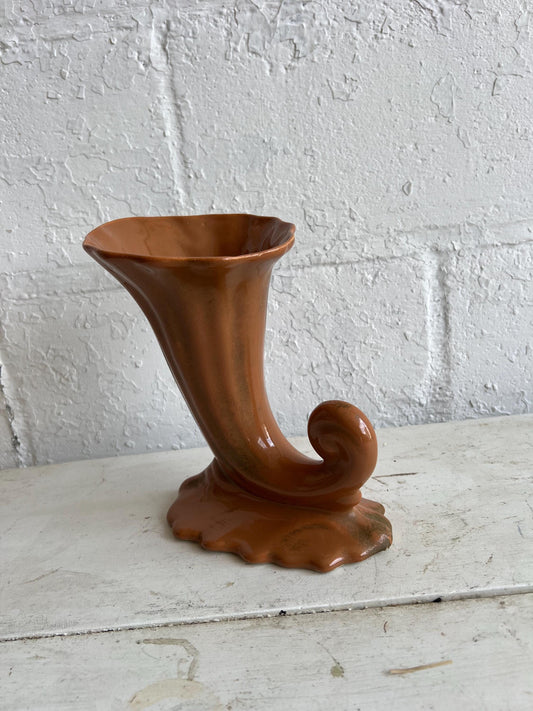 Vintage Orange Pottery Cornucopia Vase | 8.5" Tall Vintage Cornucopia Container, Fall Vintage Vase, Vintage Floral Container