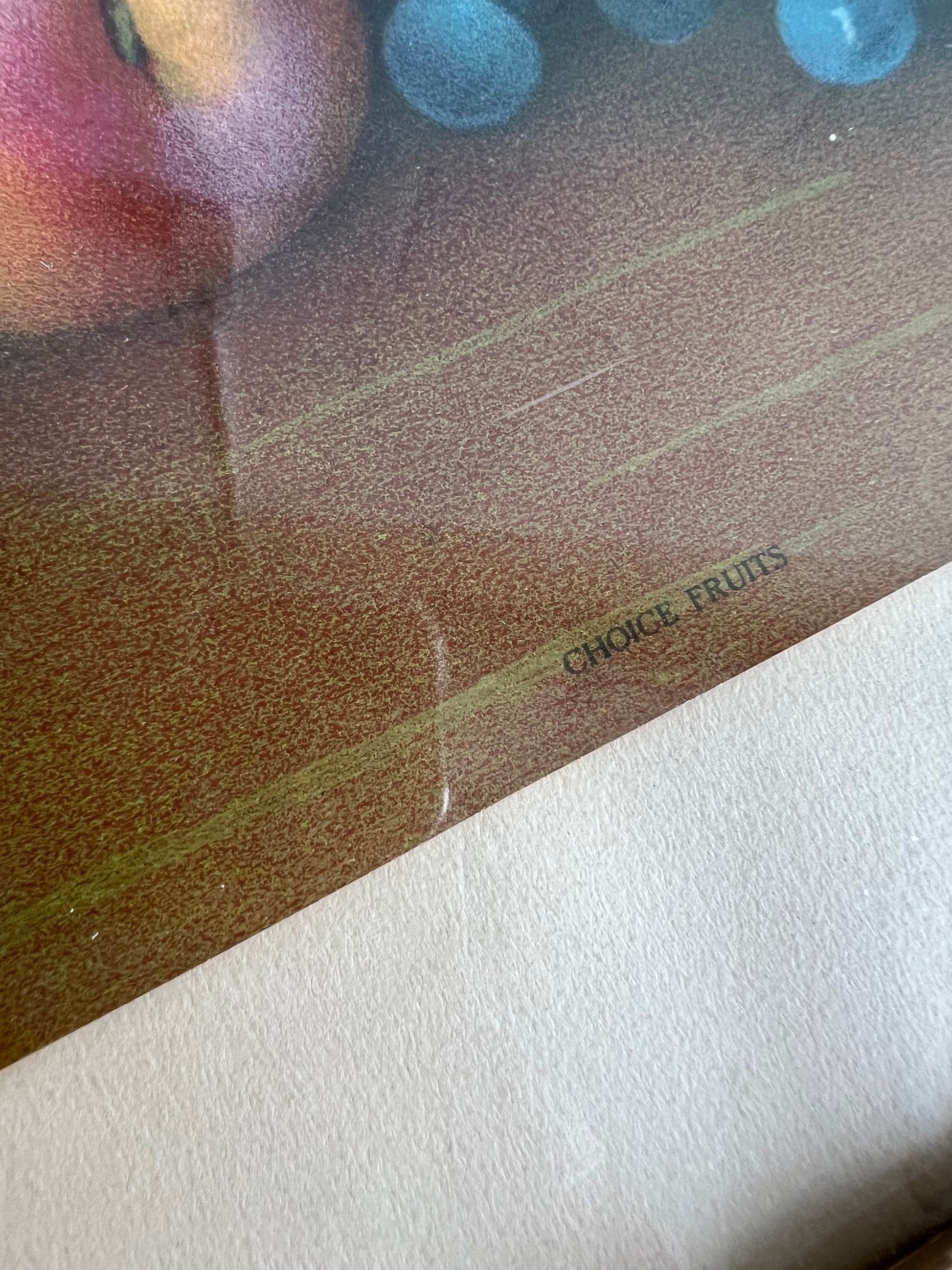 Charming fruit still lift, gold framed 17.5" x 13.5". Chromolithograph, by James Lee.