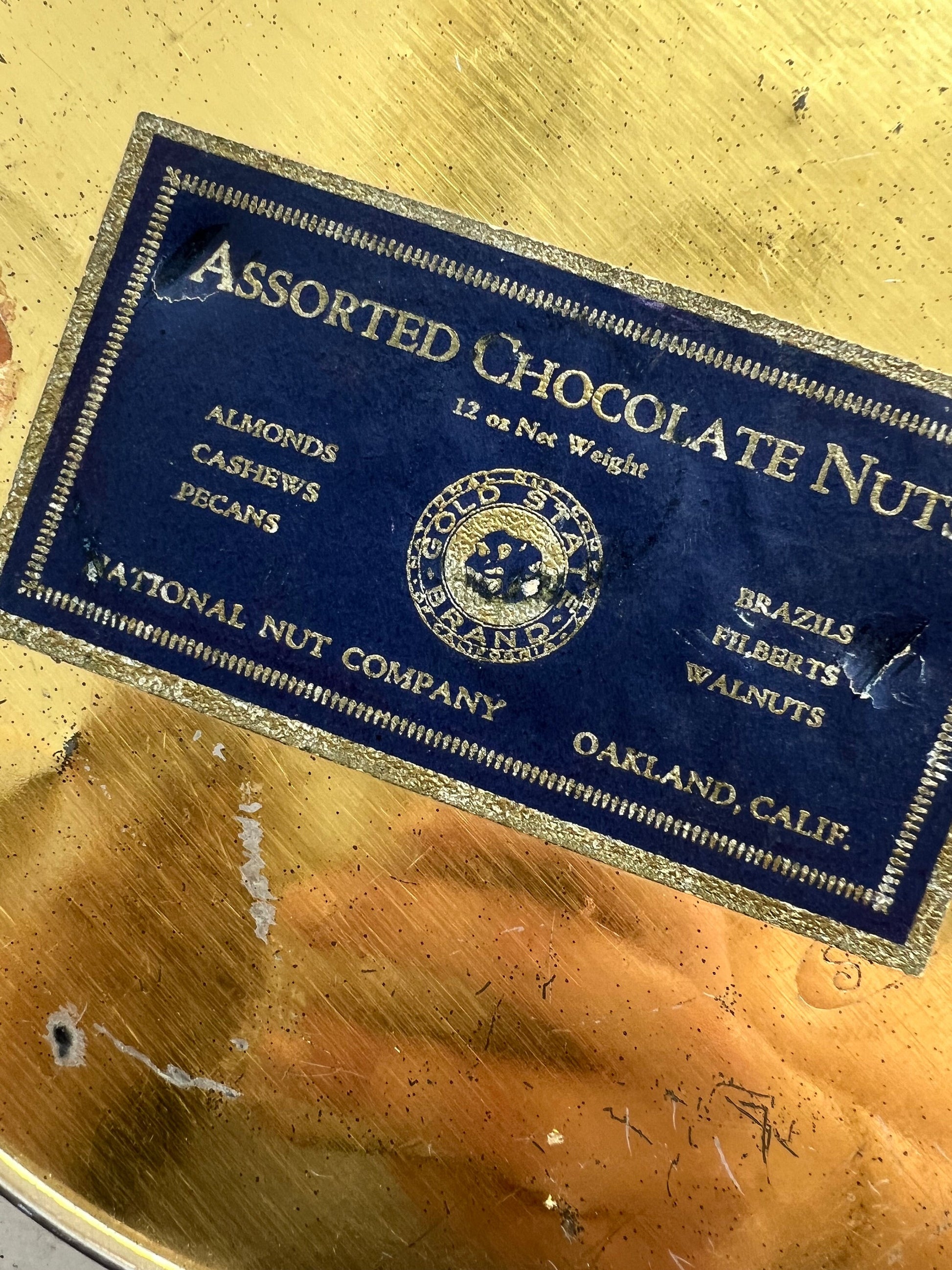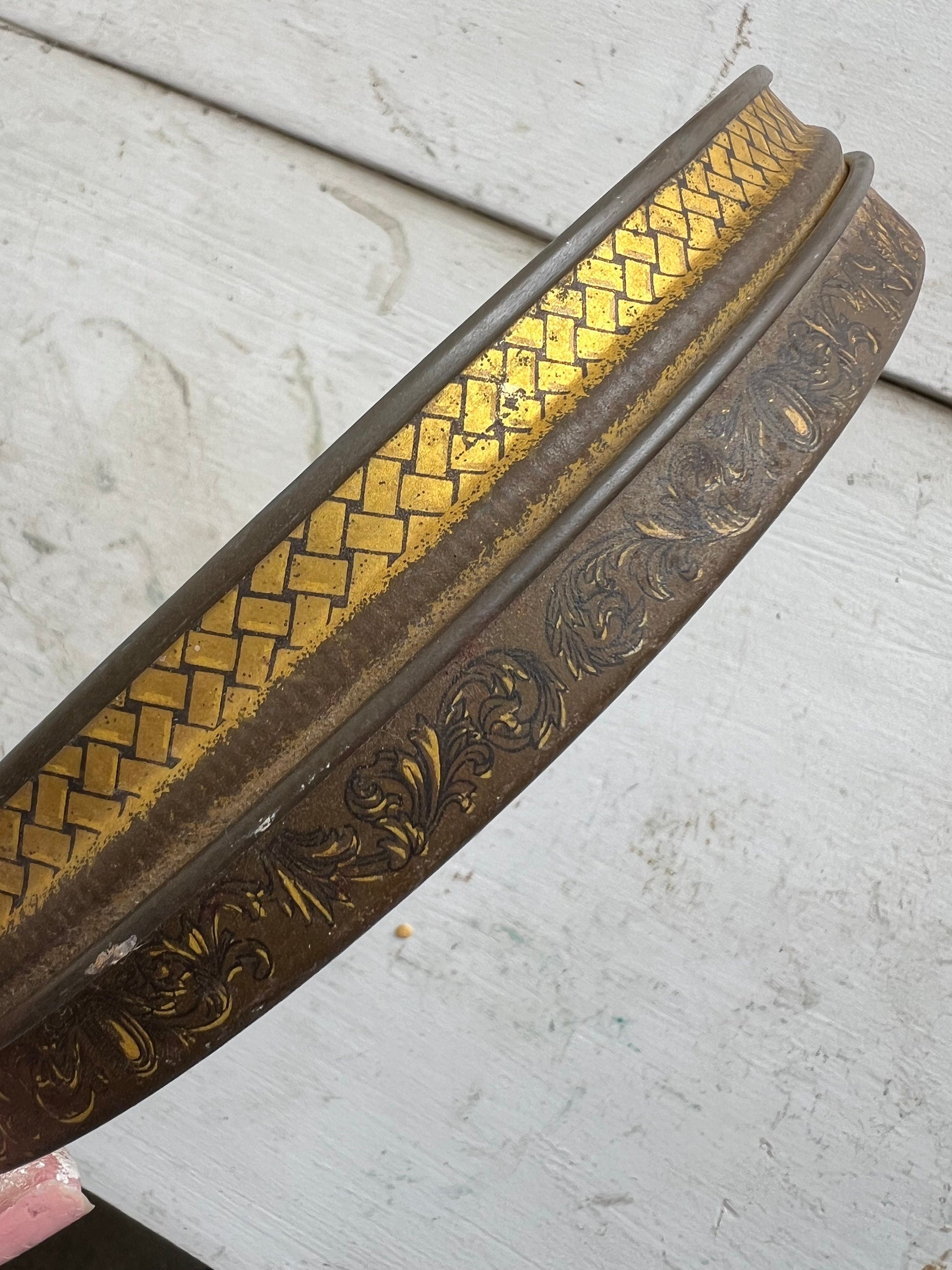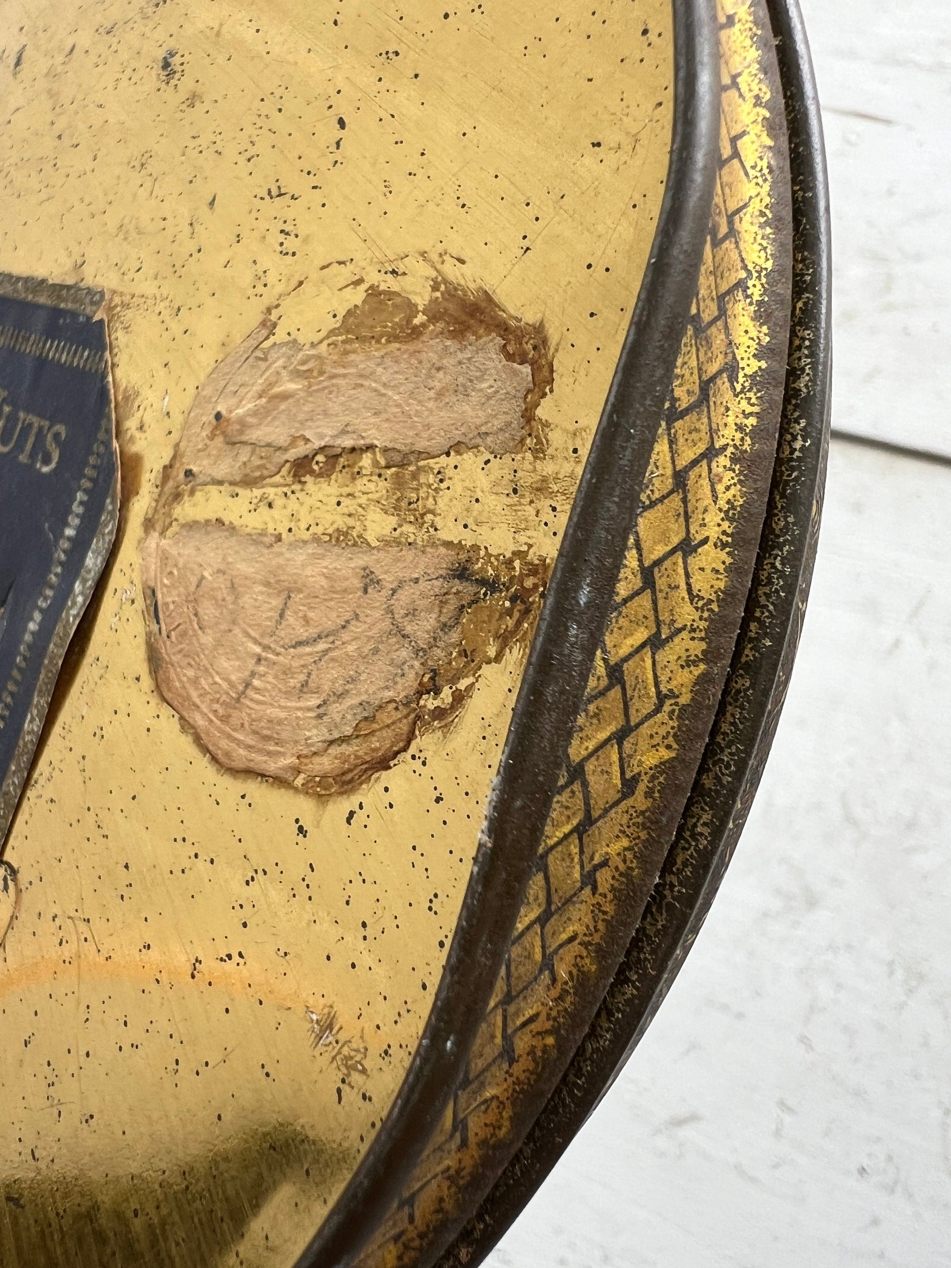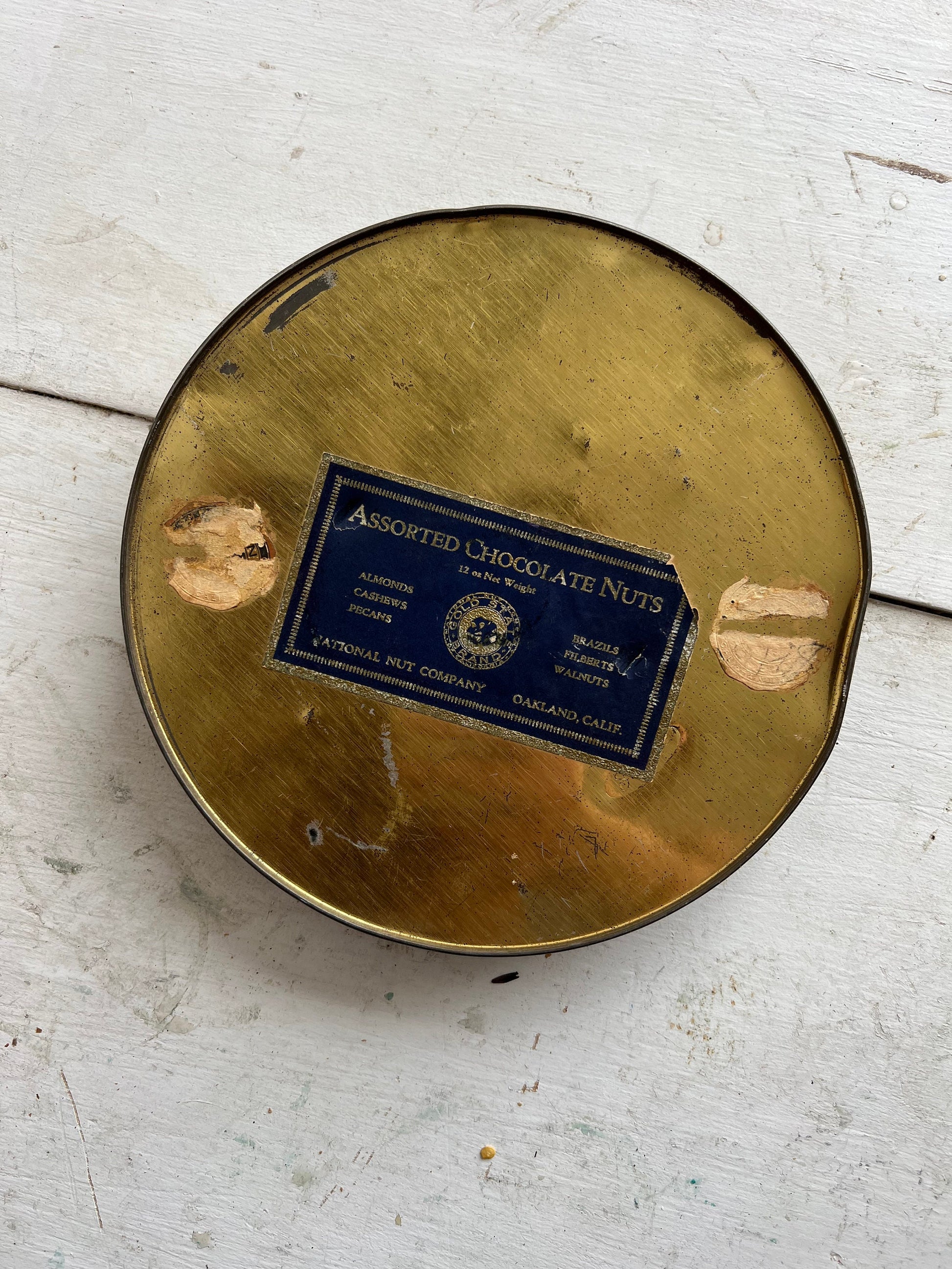 Charming vintage tin with spring mountain & garden scene to use for displaying or shelf styling. **Small dent in bottom**