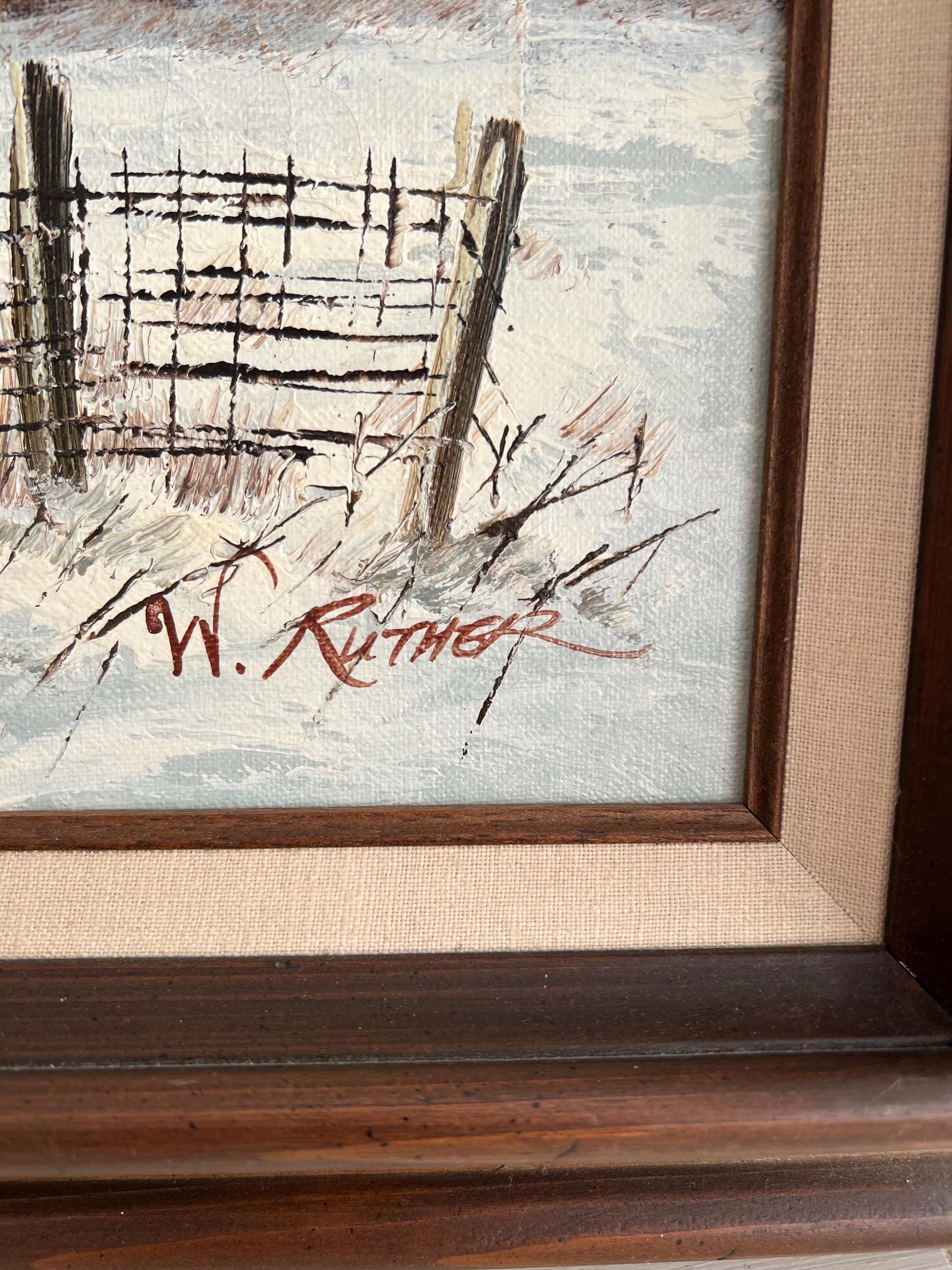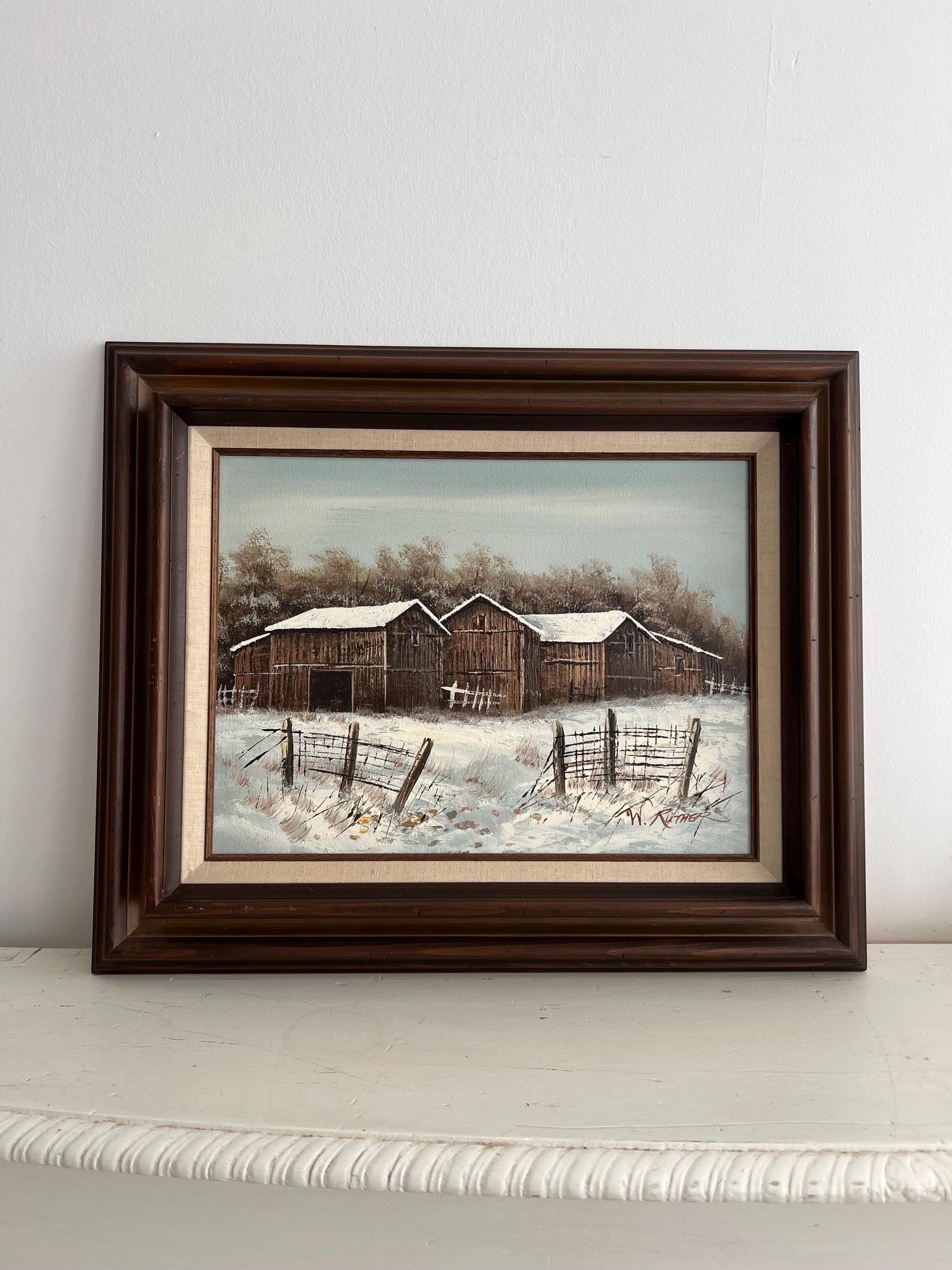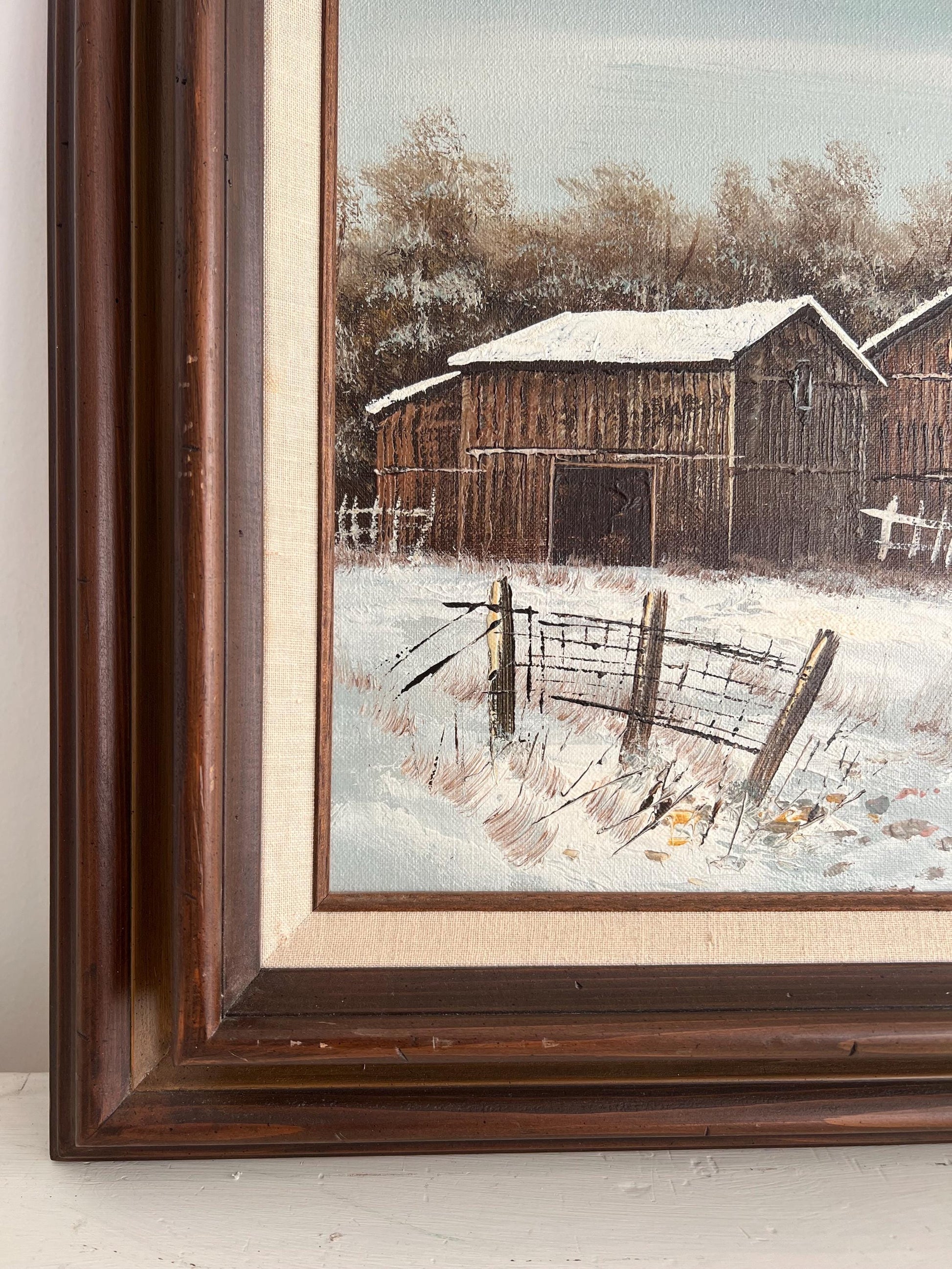 Original Vintage Farm Oil Painting, 18"x22" Framed, Vintage Farmhouse in Snow, Old Barn Painting