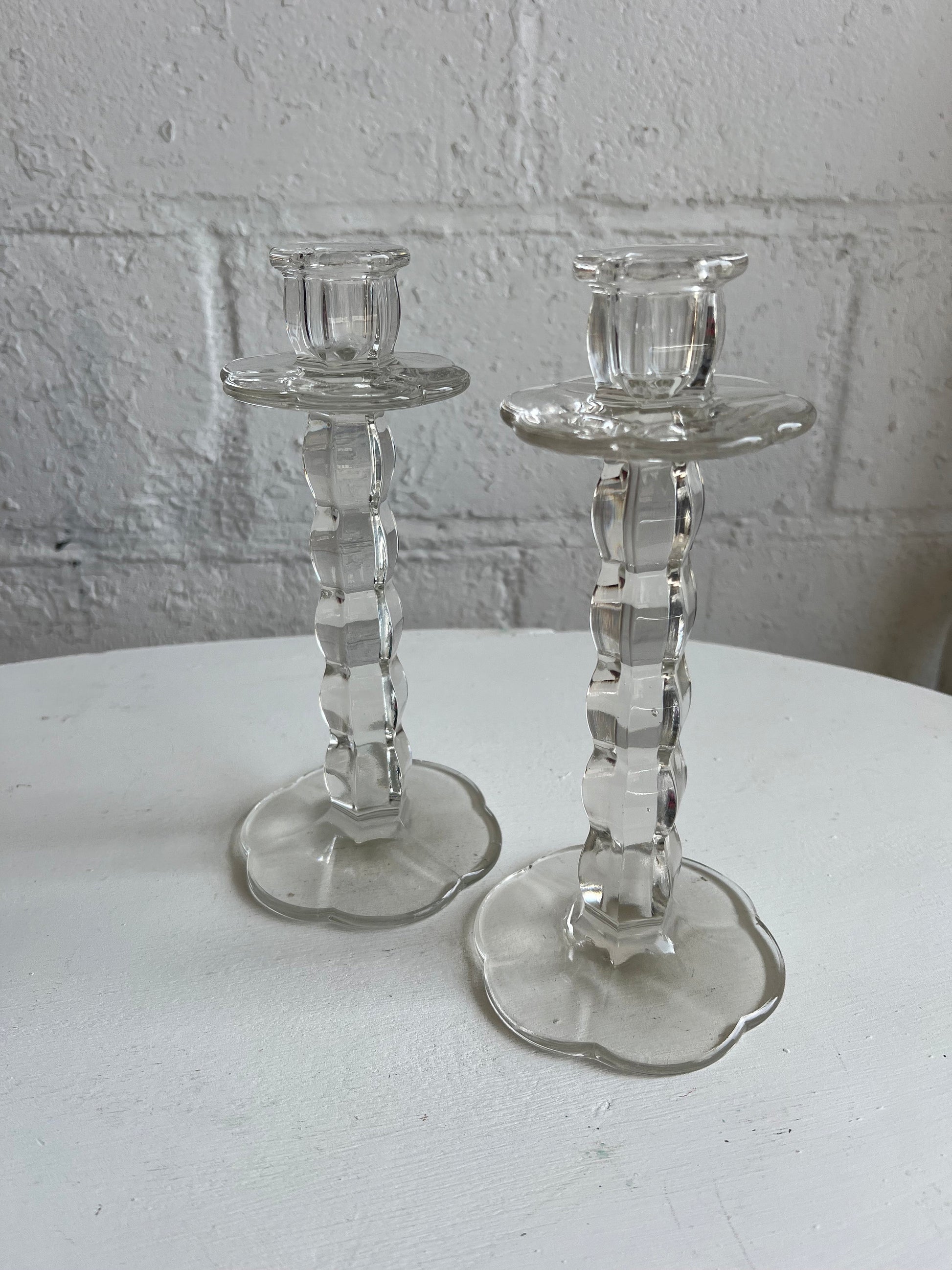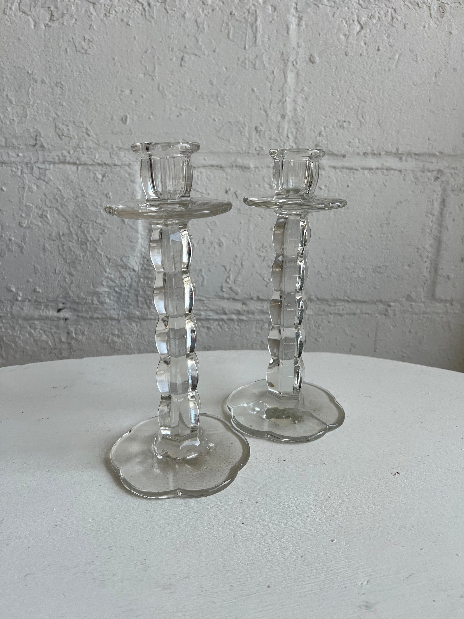Vintage Glass Candle Holder {PAIR}, 9.5" Tall Flower Shaped Bottom Detail, Heavy