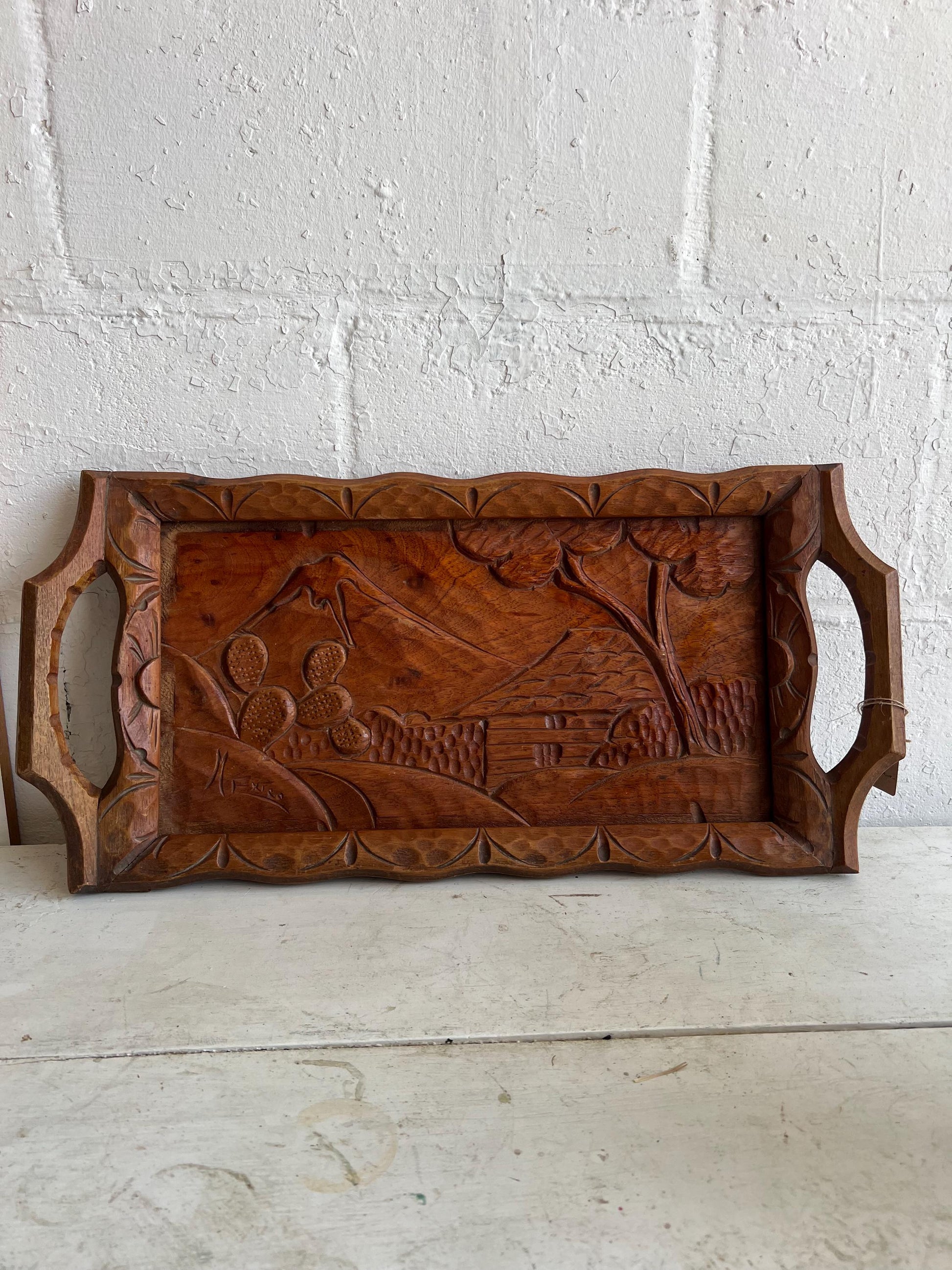 Vintage Hand Carved Wood Serving Tray, Vintage Cactus Tray, MCM Serving Tray