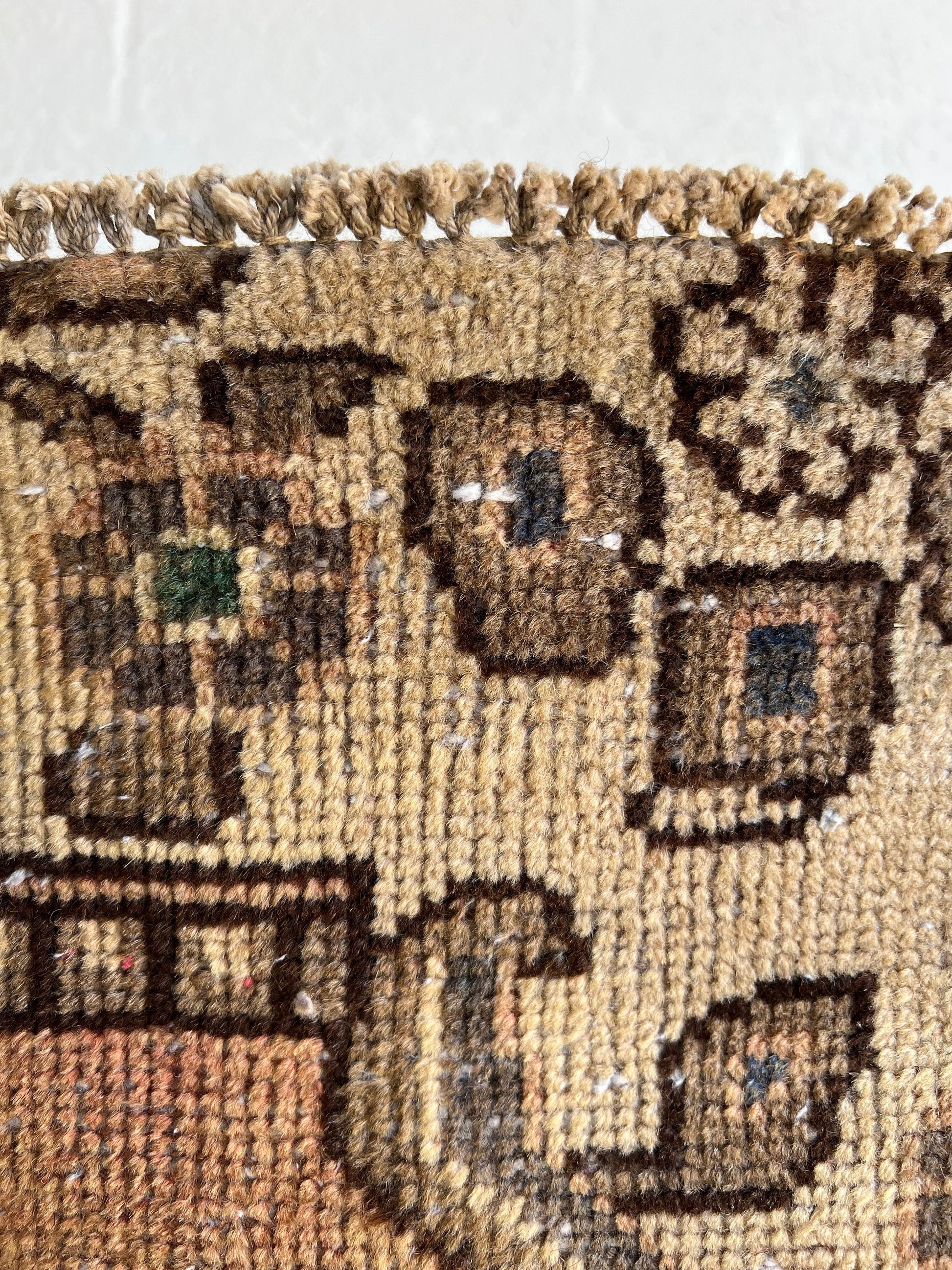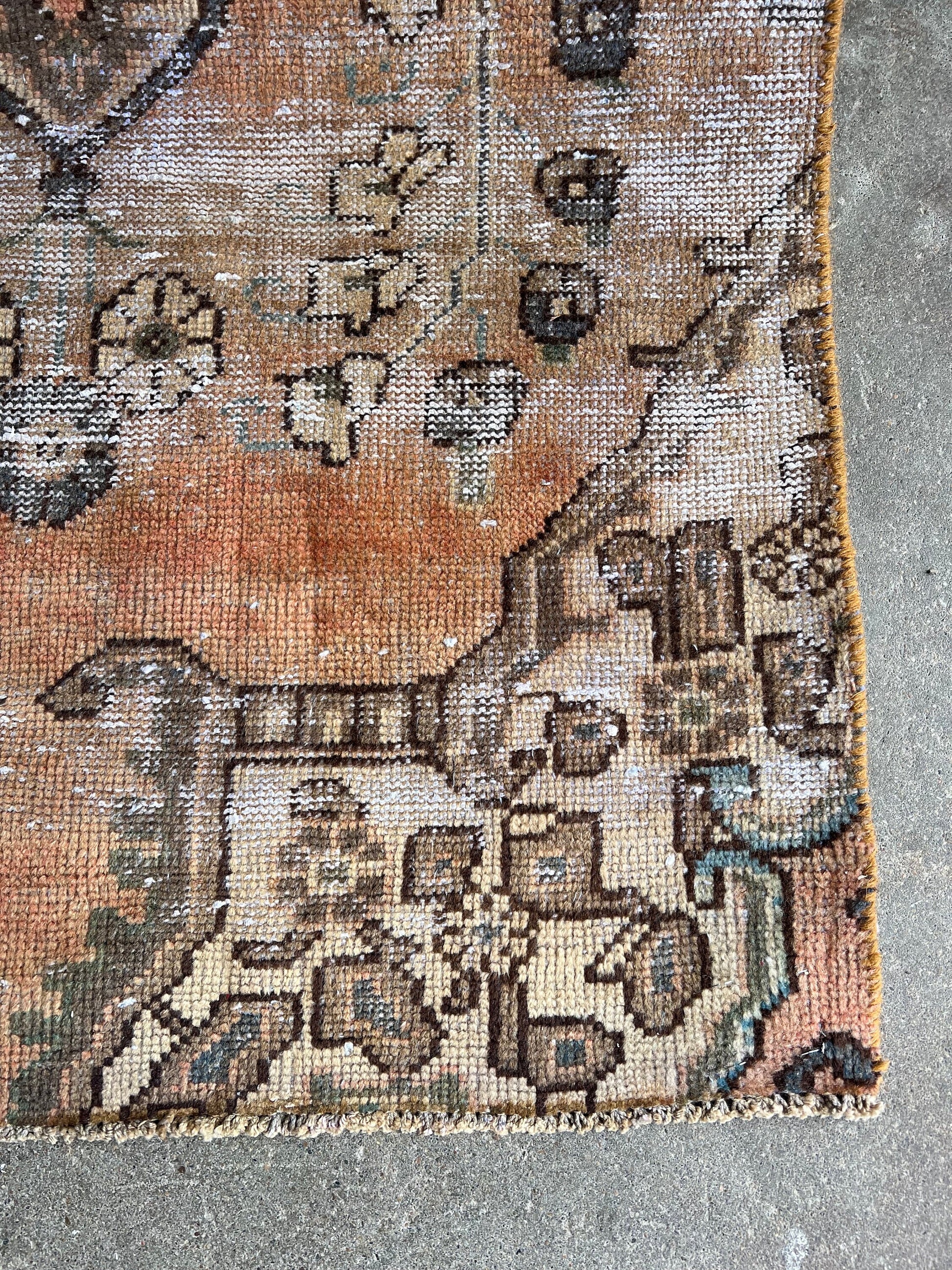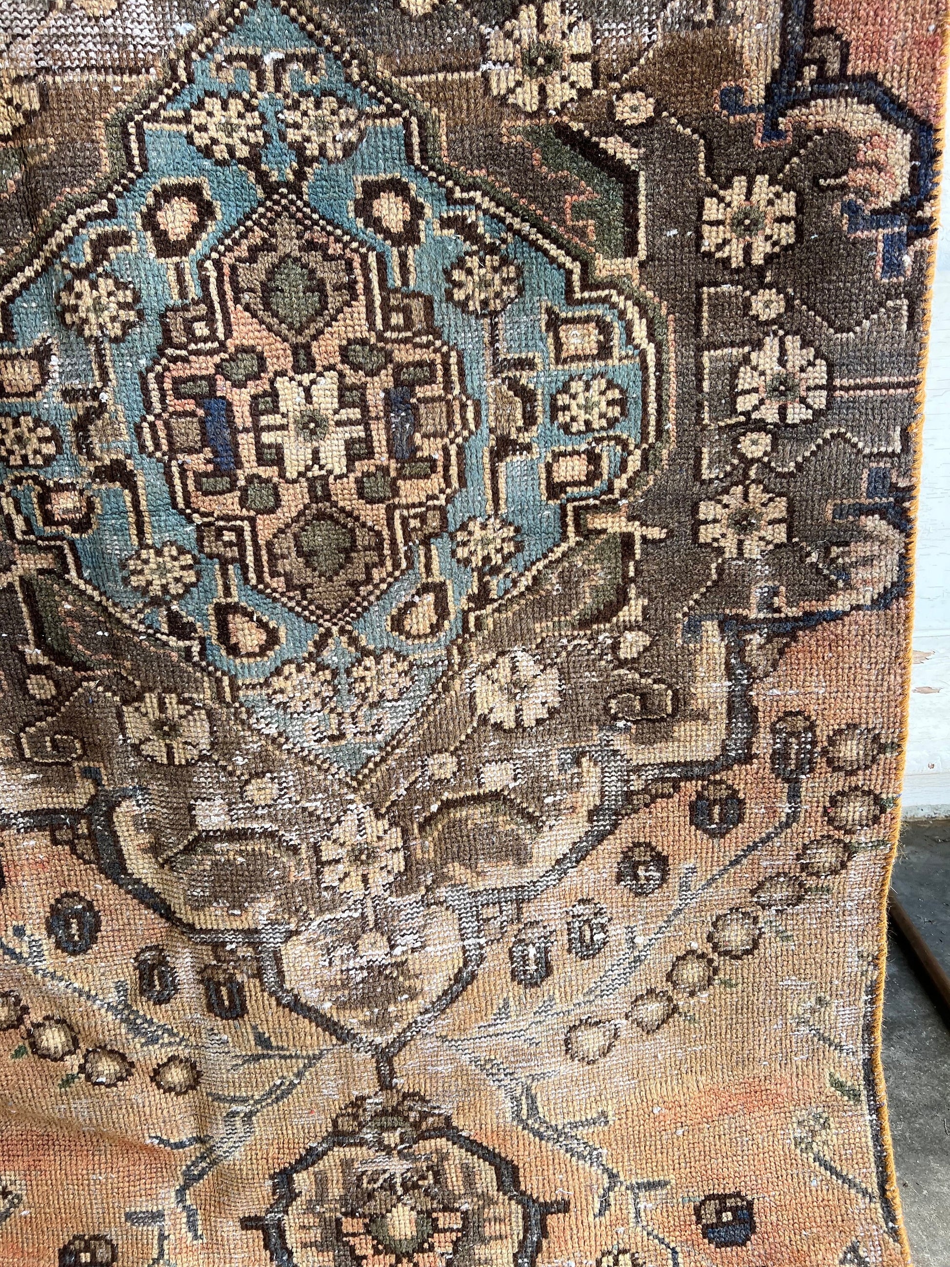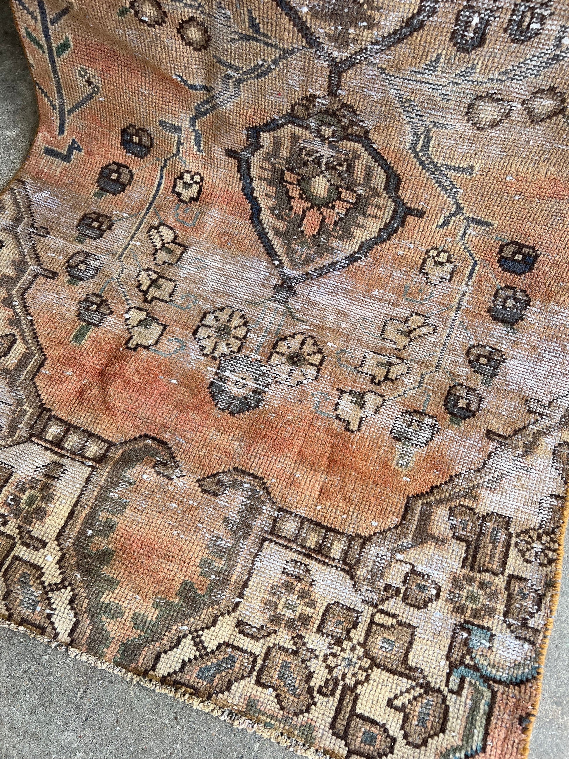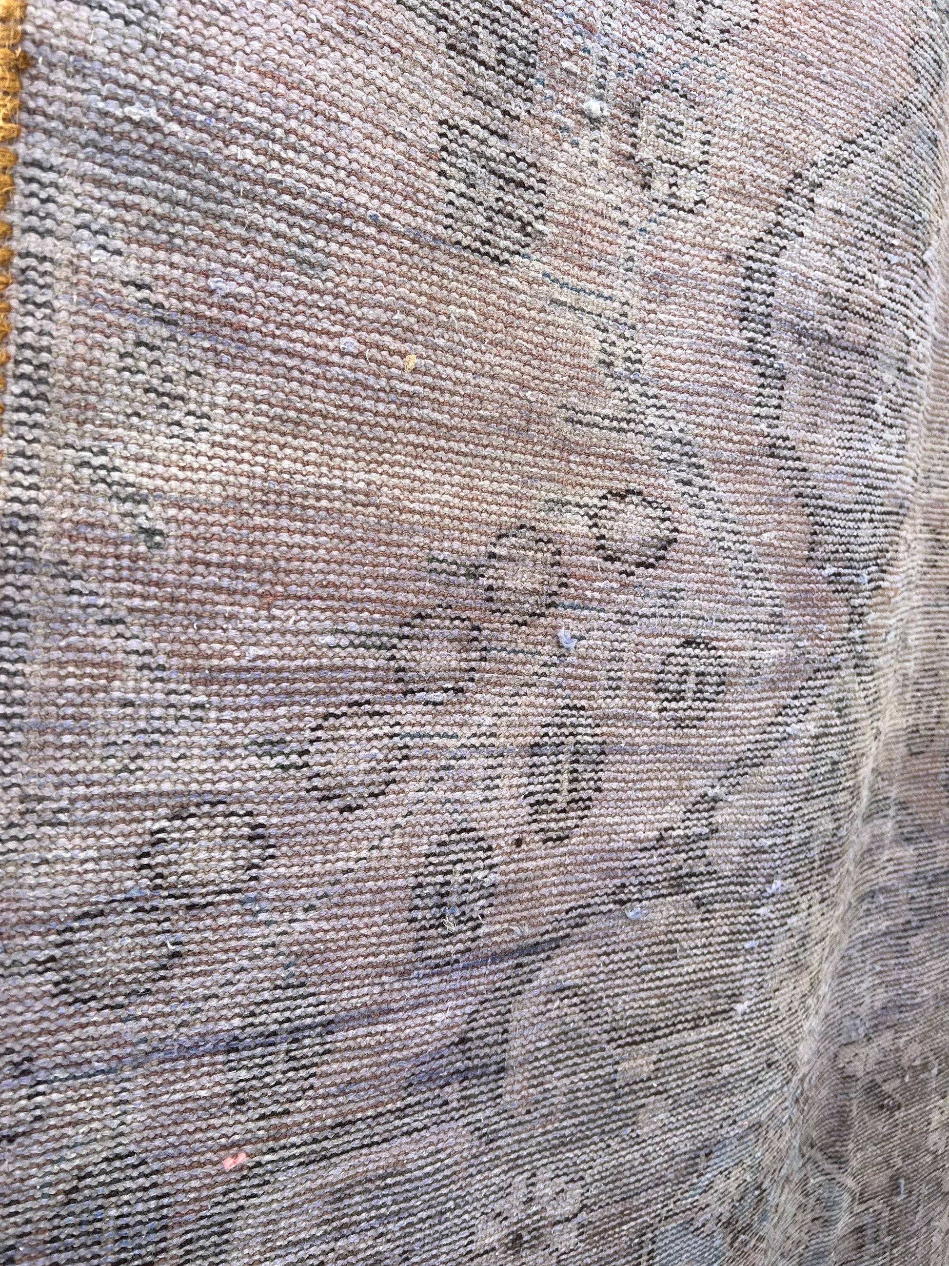 Lovely, oriental rug with lots of charm and "worn" to perfection for lovely color variations and pattern. Rugs are not perfectly straight, please review photos before buying.
