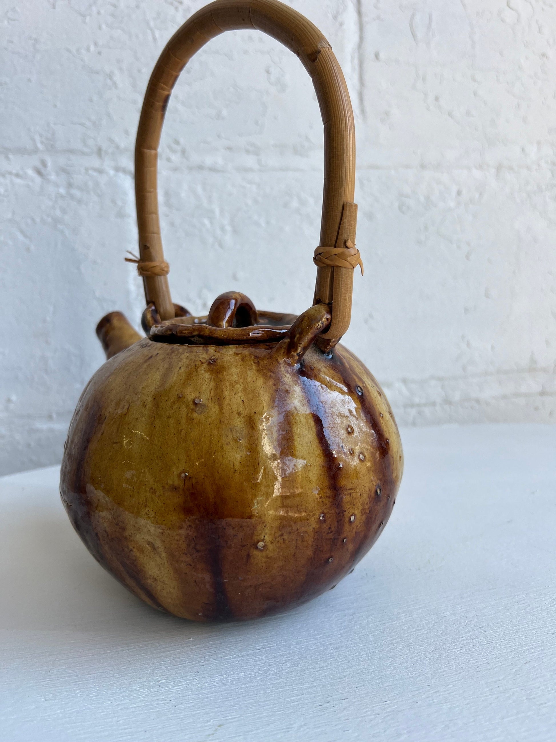 Vintage Pottery Teapot with Brown Glaze & Bamboo Handle