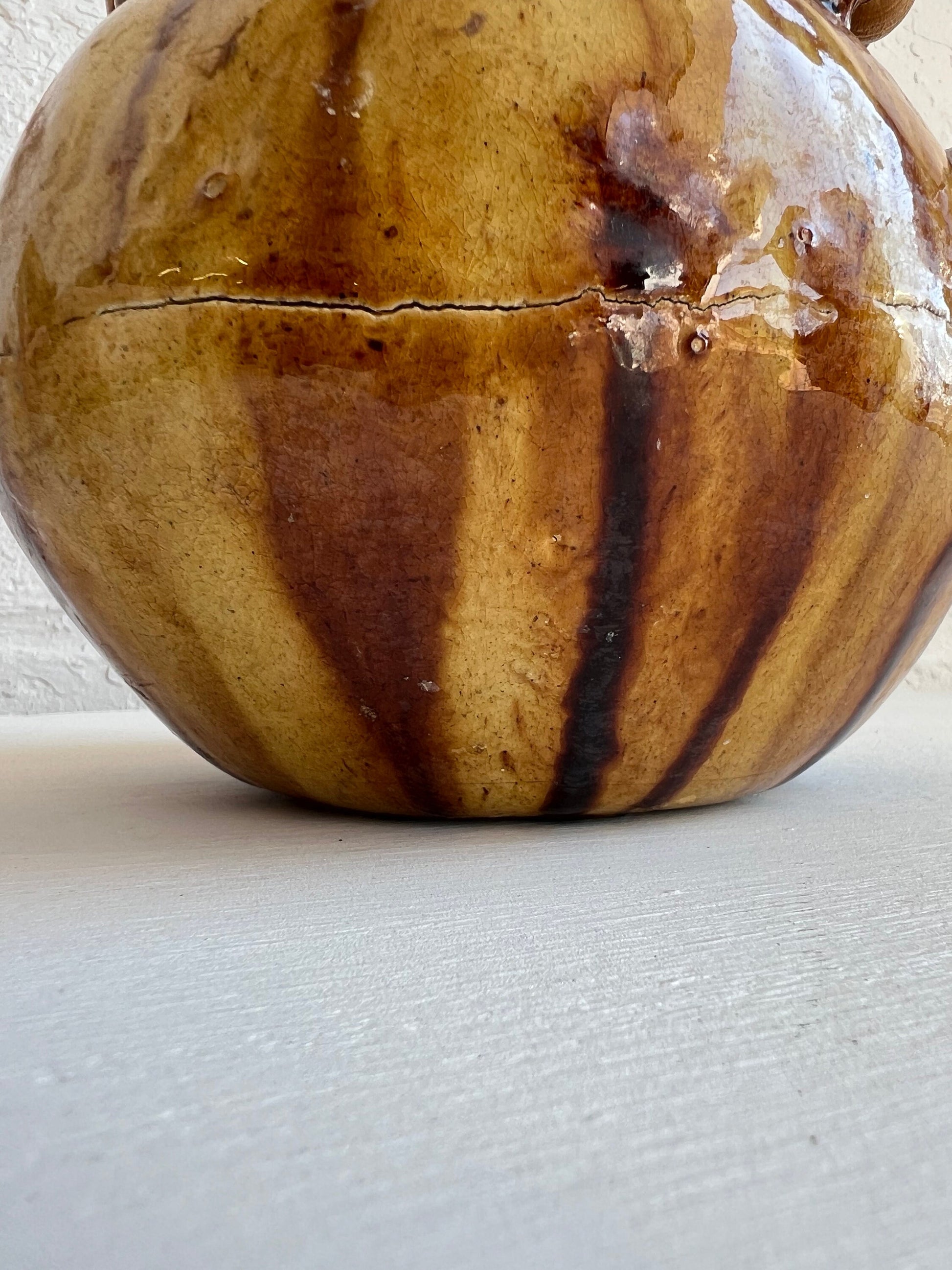 Charming handmade teapot with brown pottery glaze. See pictures of slight cracks in piece. Unknown whether functional or holds water, just a charming piece for decorating.